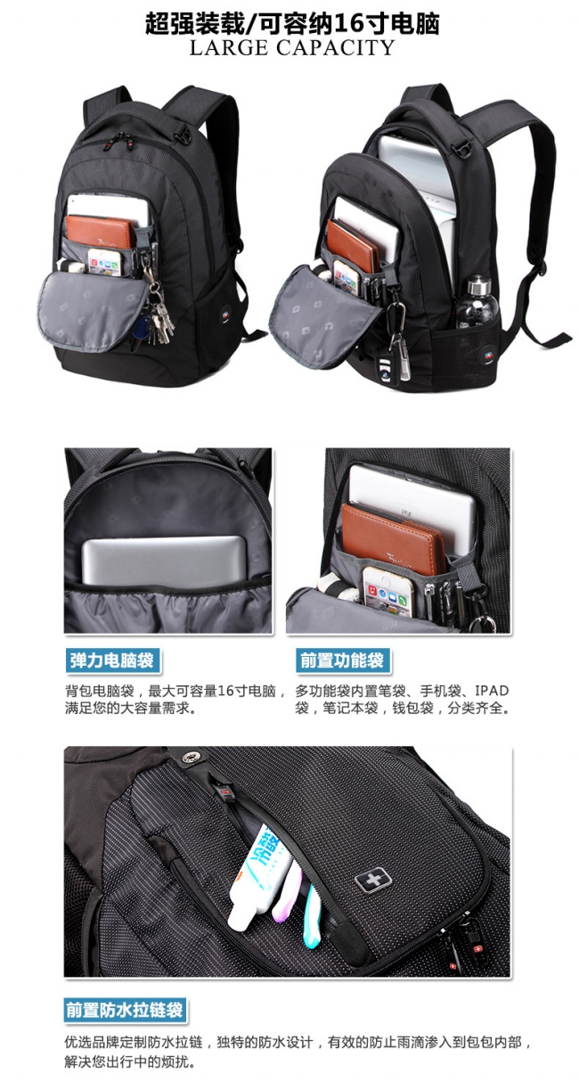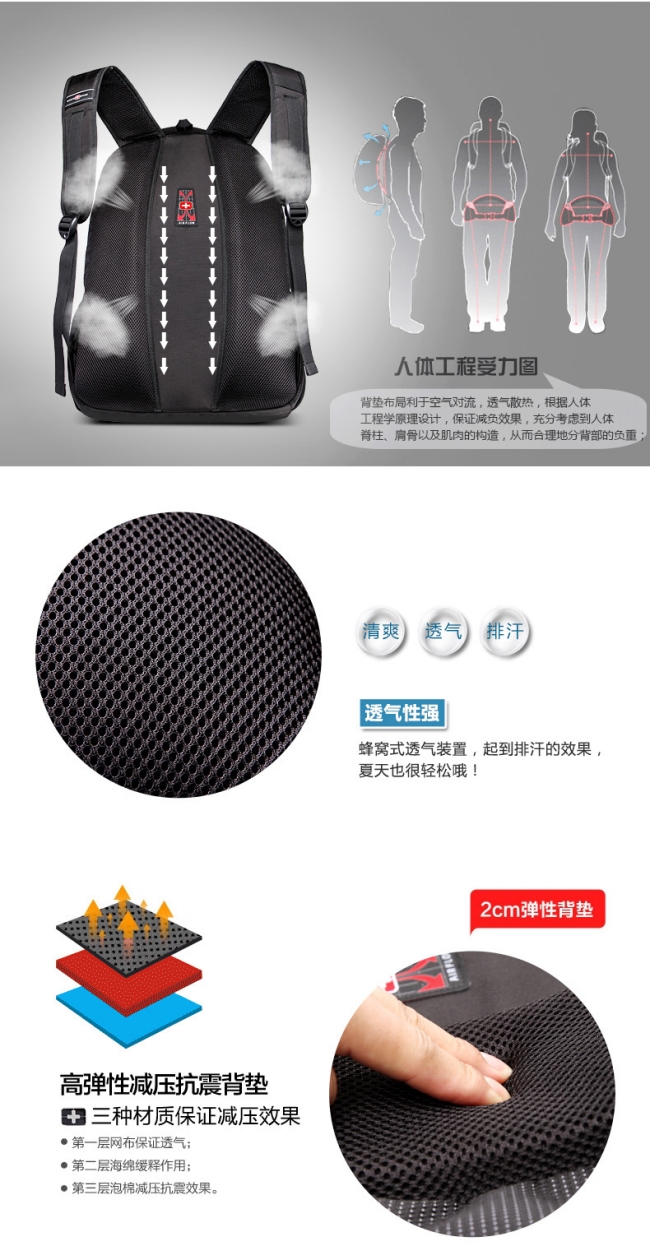 内部结构: 网袋 拉链暗袋 手机袋 证件袋 夹层拉链袋 电脑插袋 相机插袋