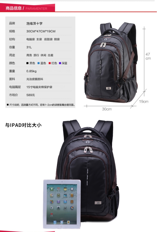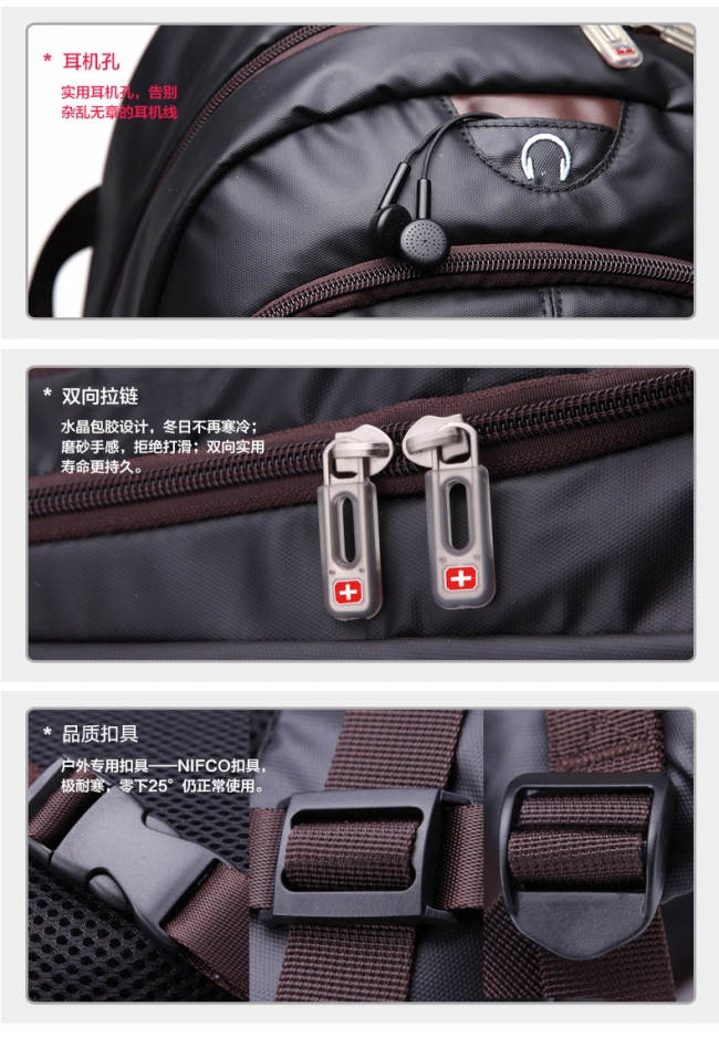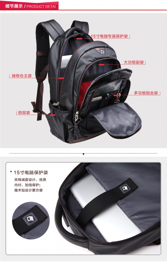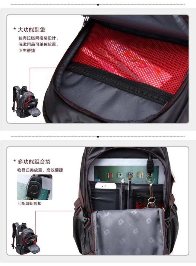内部结构: 网袋 拉链暗袋 手机袋 证件袋 夹层拉链袋 电脑插袋 相机插袋