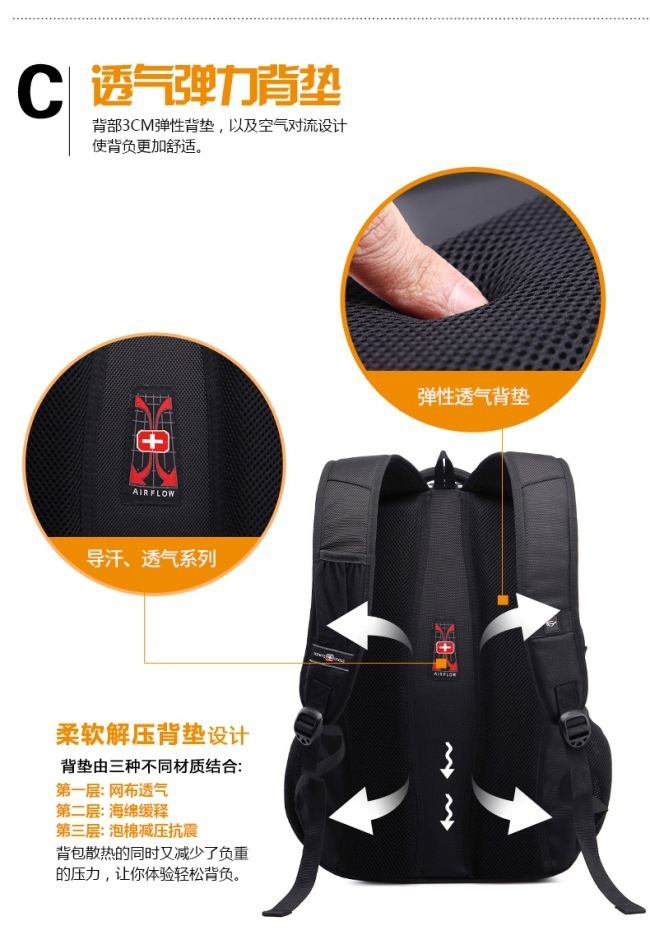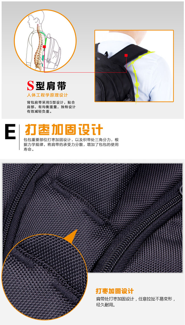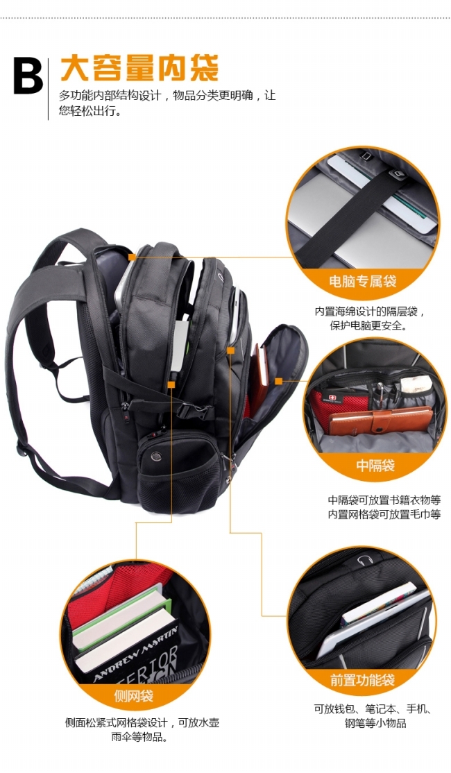 内部结构: 网袋 拉链暗袋 手机袋 证件袋 夹层拉链袋 电脑插袋 相机插袋