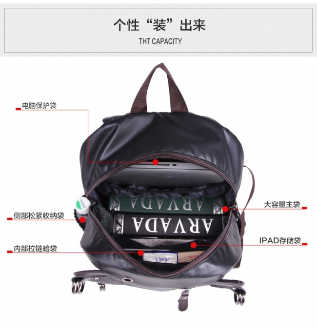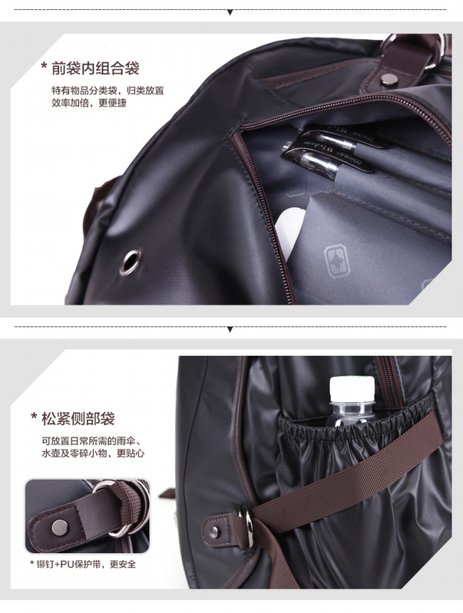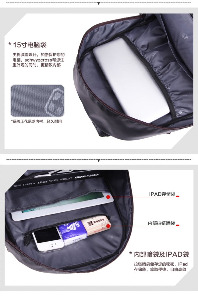 内部结构: 拉链暗袋 手机袋 证件袋 夹层拉链袋 电脑插袋 相机插袋