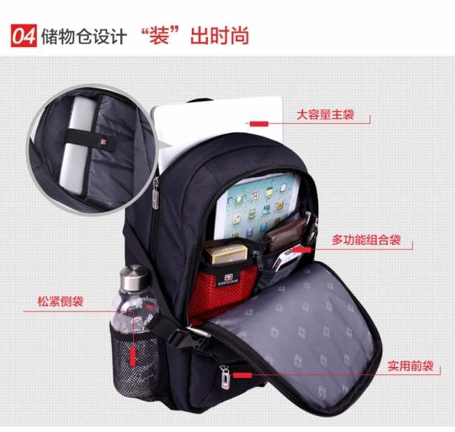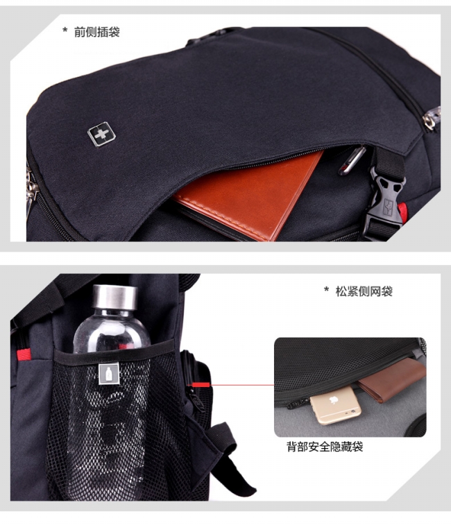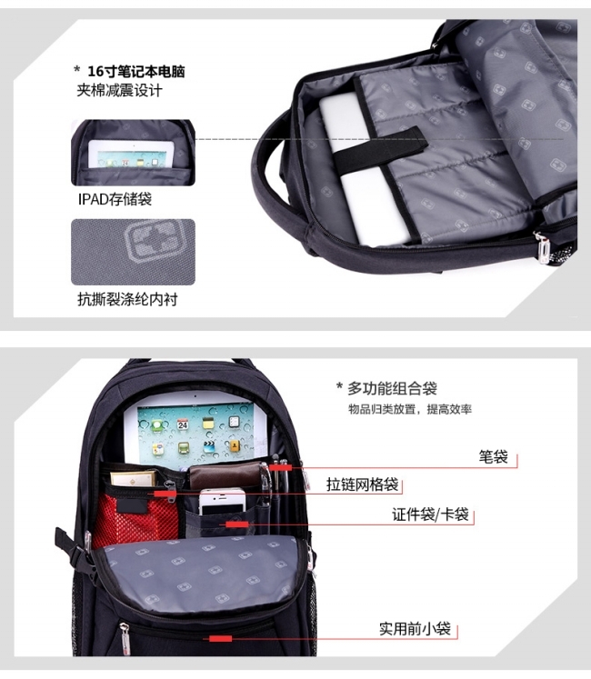 内部结构: 网袋 拉链暗袋 手机袋 证件袋 夹层拉链袋 电脑插袋 相机插袋