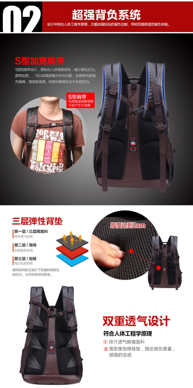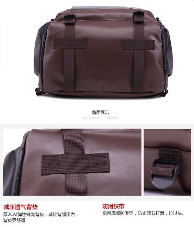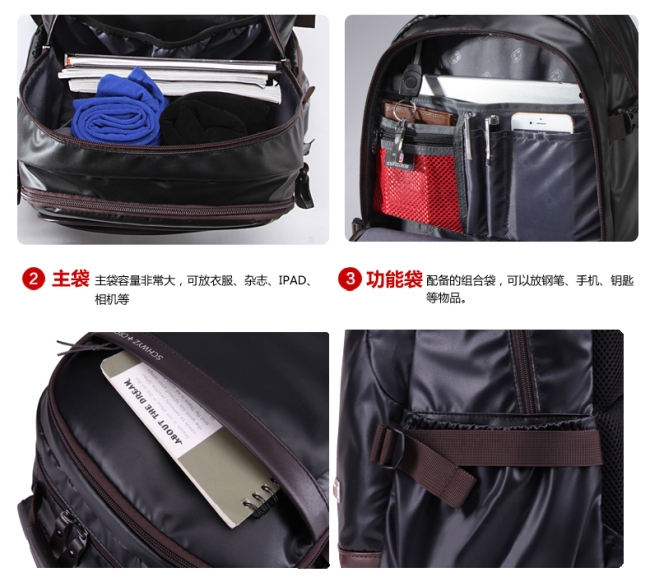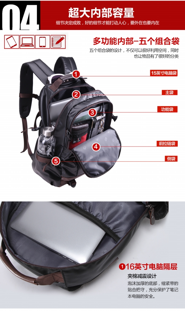 内部结构: 网袋 拉链暗袋 手机袋 证件袋 夹层拉链袋 电脑插袋 相机插袋