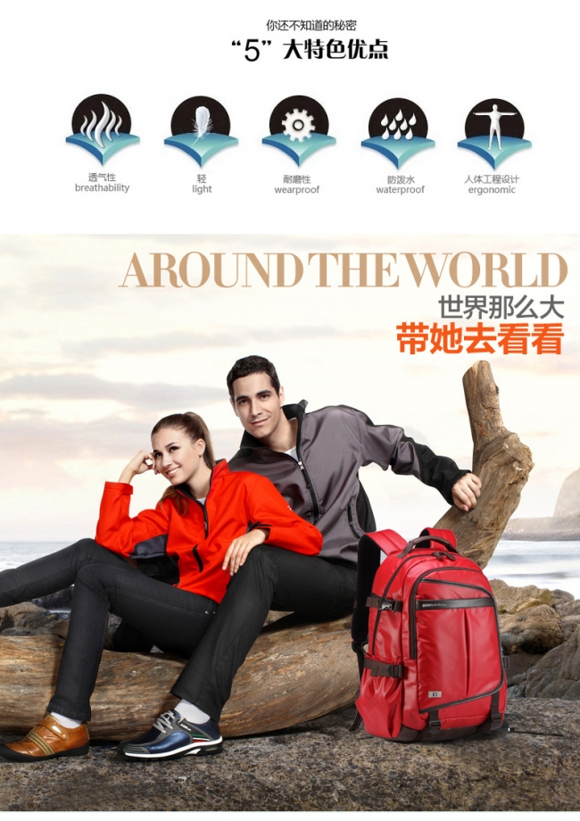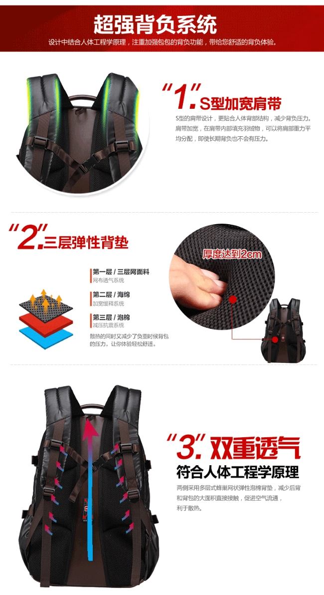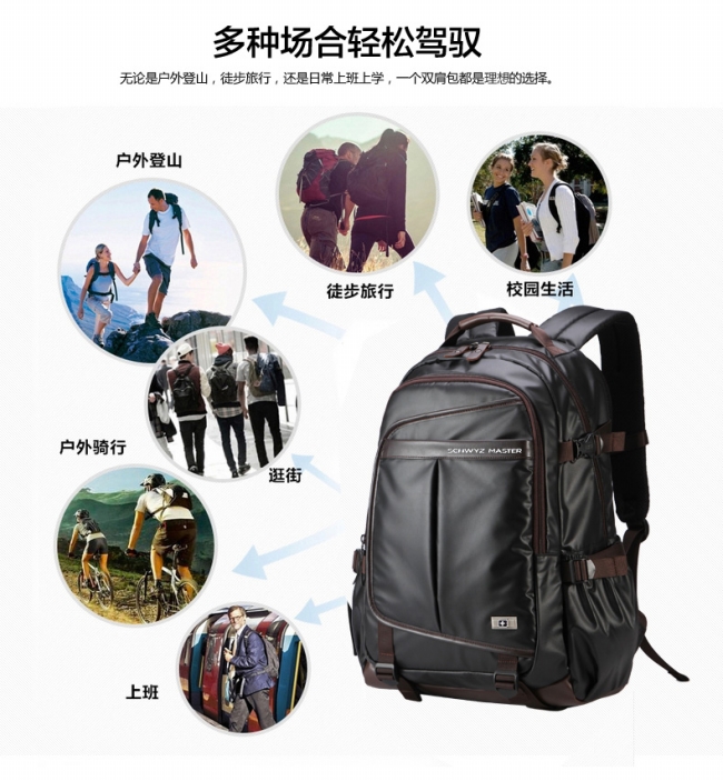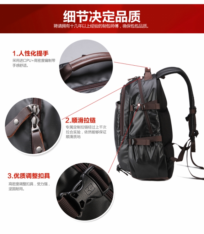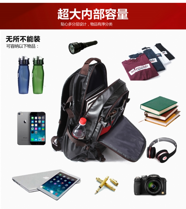 内部结构: 网袋 拉链暗袋 手机袋 证件袋 夹层拉链袋 电脑插袋 相机插袋