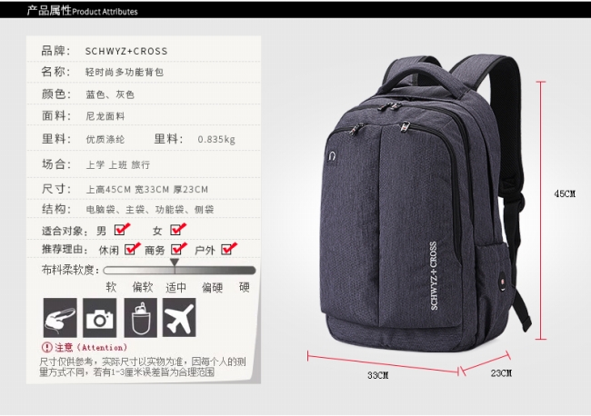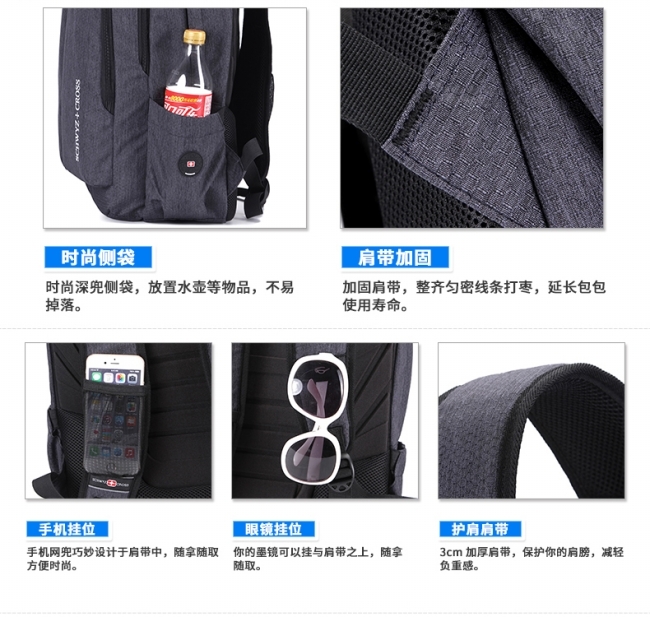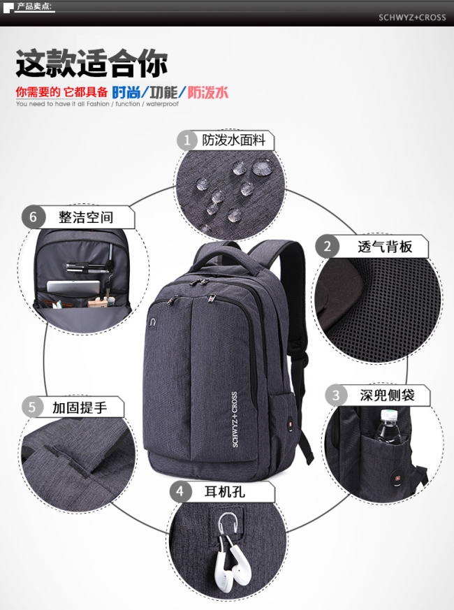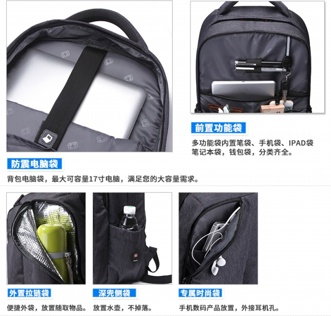 内部结构: 网袋 拉链暗袋 手机袋 证件袋 夹层拉链袋 电脑插袋 相机插袋