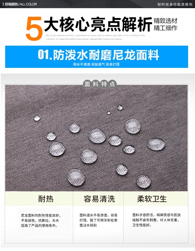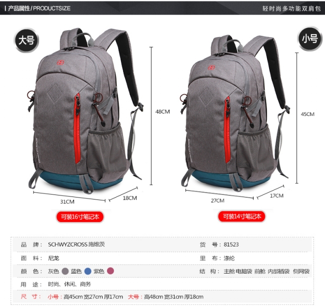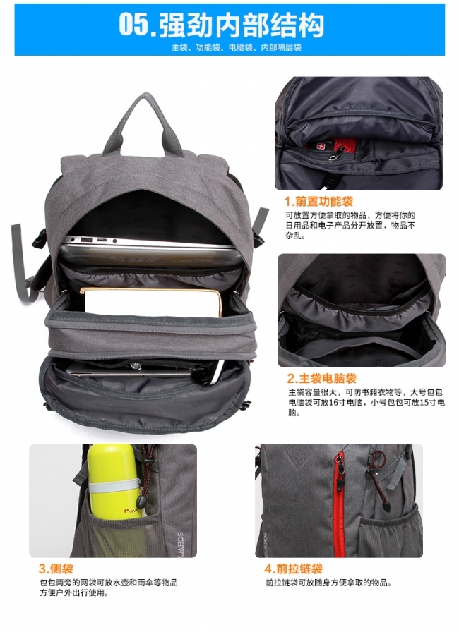 内部结构: 网袋 拉链暗袋 手机袋 证件袋 夹层拉链袋 电脑插袋 相机插袋