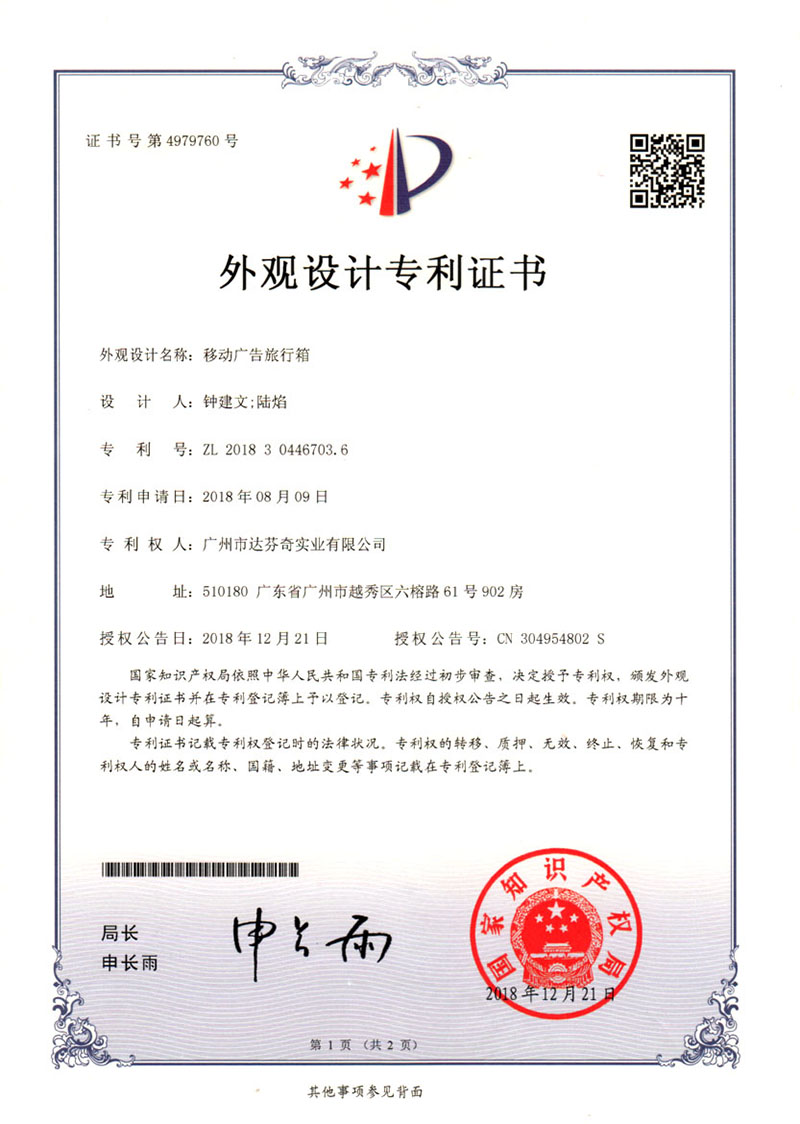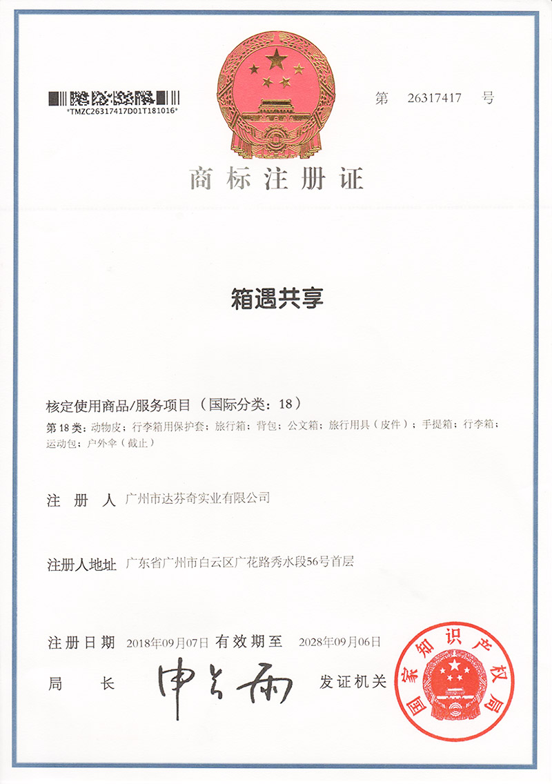 企业注册了箱遇、共享箱遇第9、18类注册商标,获得箱遇移动互联网共享箱包租赁软件 、箱遇共享箱包智能交互软件、箱遇共享箱包全球定位防盗软件、共享箱包微信公众号管理系统等多个计算机软件著作权。获得了一种移动互联网和箱包连接交互系统的实用新型专利及移动广告旅行箱的外观专利,正在申请中的发明专利:一种箱包移动互联网动态广告系统和方法和有固定取还点的箱包租赁运营系统及其方法正在专利核准中!我们的目标就是通过共享箱包,箱包展示广告承担消费者使用箱包的费用,消费者使用箱包都不用钱而且可以通过展示广告获得收益!