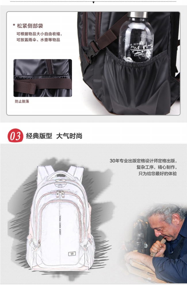 内部结构: 网袋 拉链暗袋 手机袋 证件袋 夹层拉链袋 电脑插袋 相机插袋