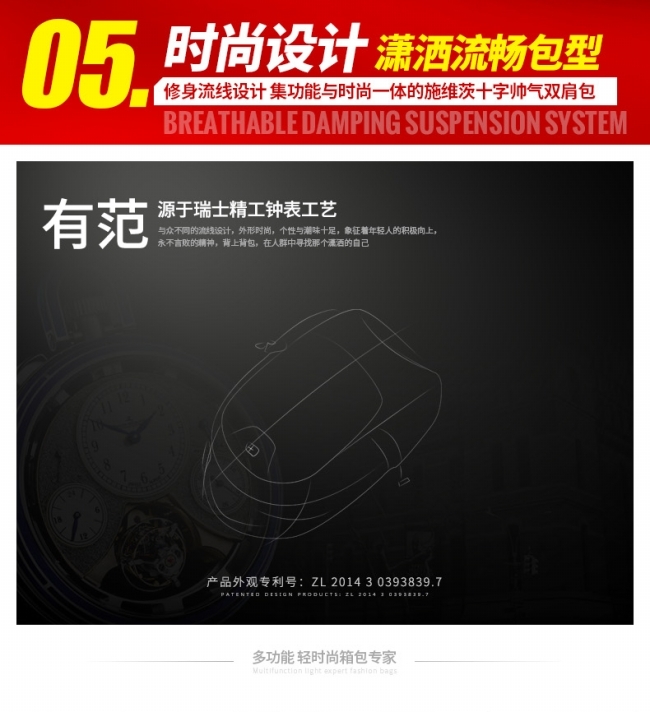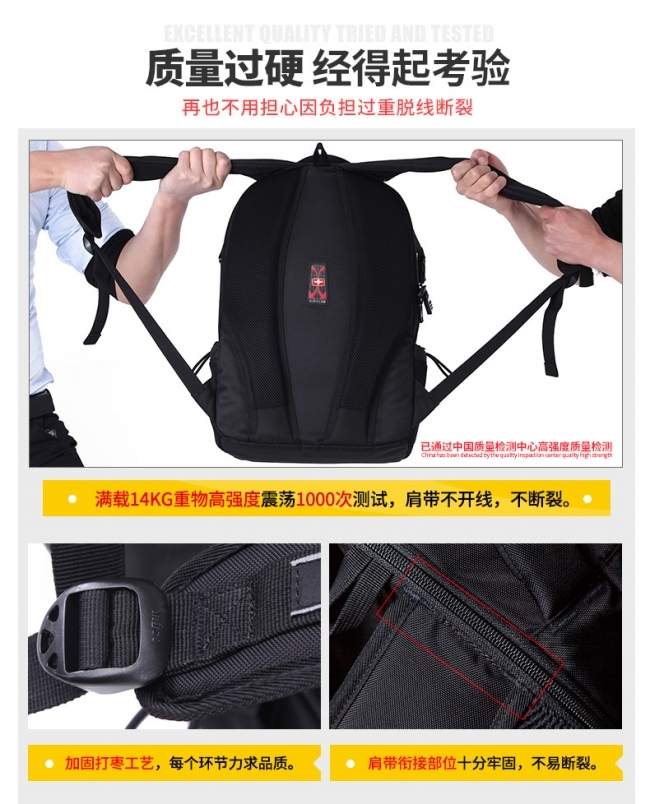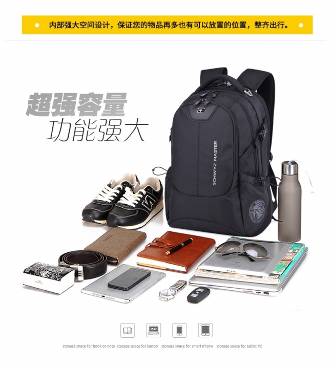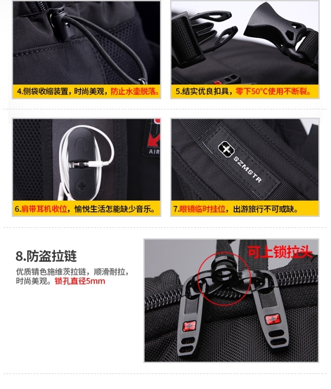内部结构: 网袋 拉链暗袋 手机袋 证件袋 夹层拉链袋 电脑插袋 相机插袋