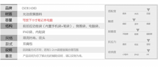 内部结构: 拉链暗袋 手机袋 证件袋 夹层拉链袋 电脑插袋 相机插袋