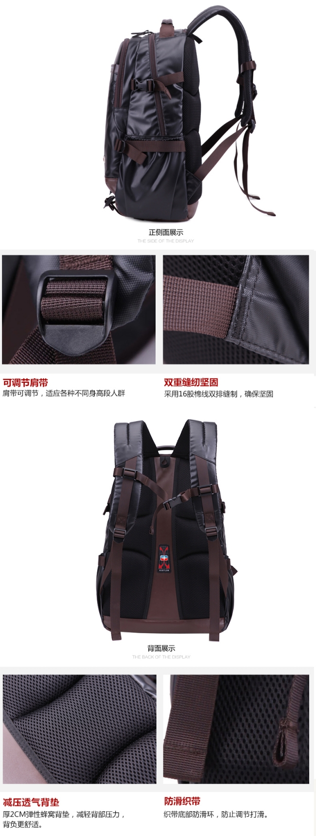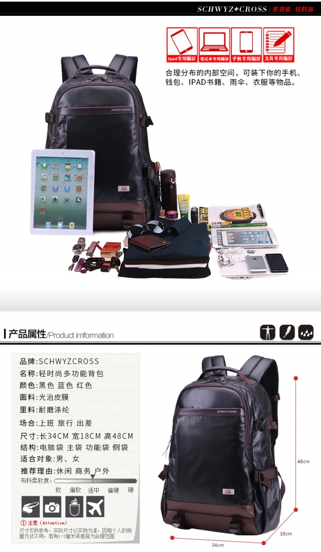 内部结构: 网袋 拉链暗袋 手机袋 证件袋 夹层拉链袋 电脑插袋 相机插袋