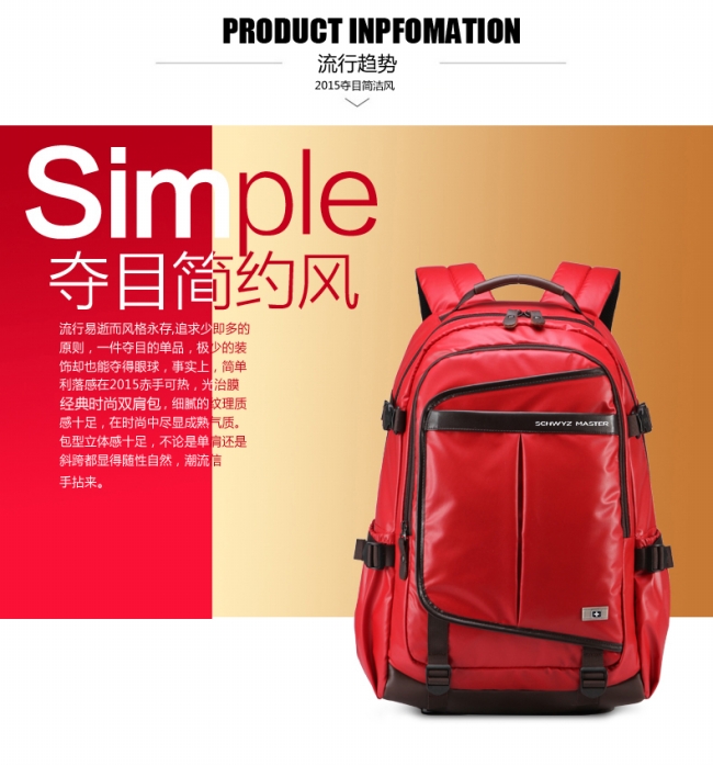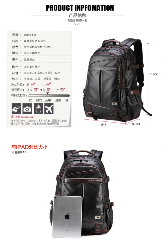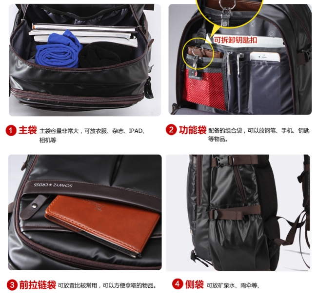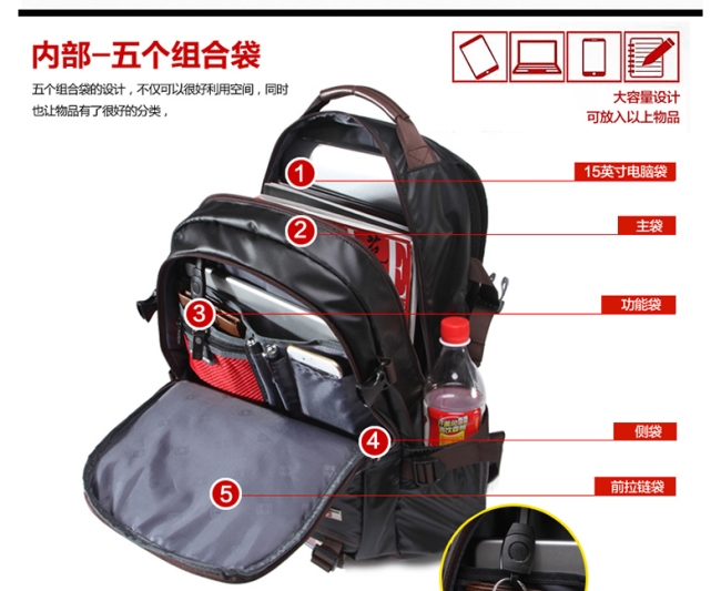 内部结构: 网袋 拉链暗袋 手机袋 证件袋 夹层拉链袋 电脑插袋 相机插袋