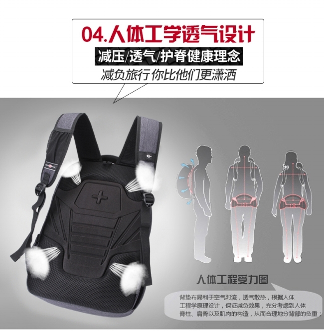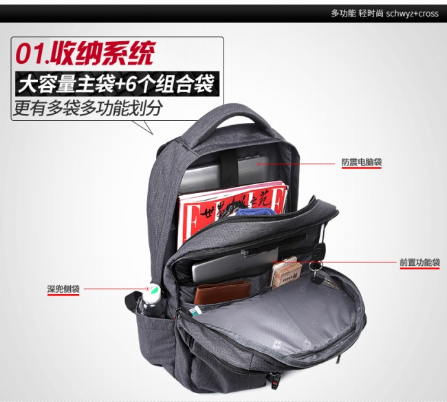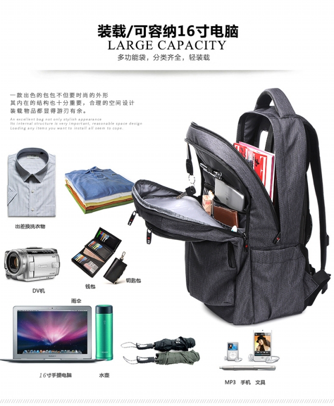 内部结构: 网袋 拉链暗袋 手机袋 证件袋 夹层拉链袋 电脑插袋 相机插袋