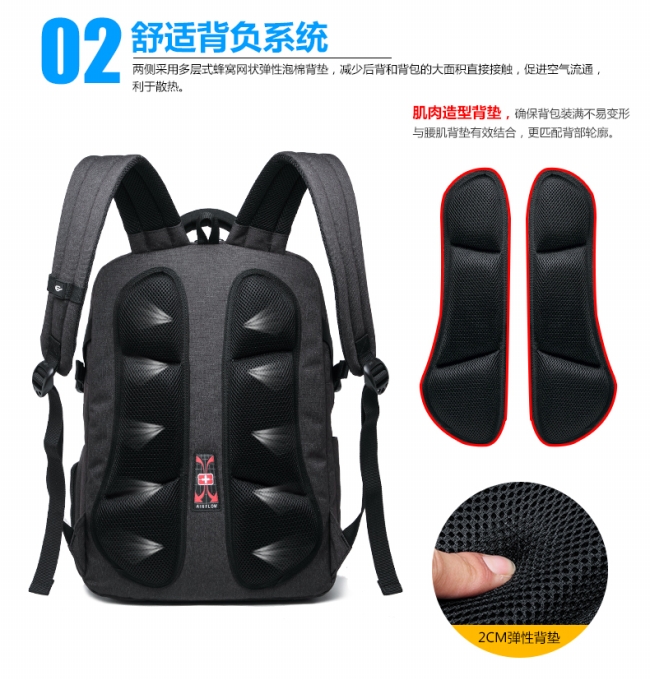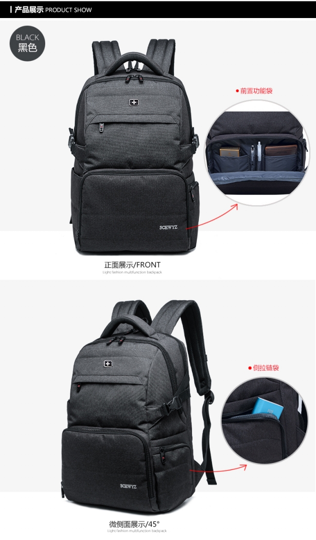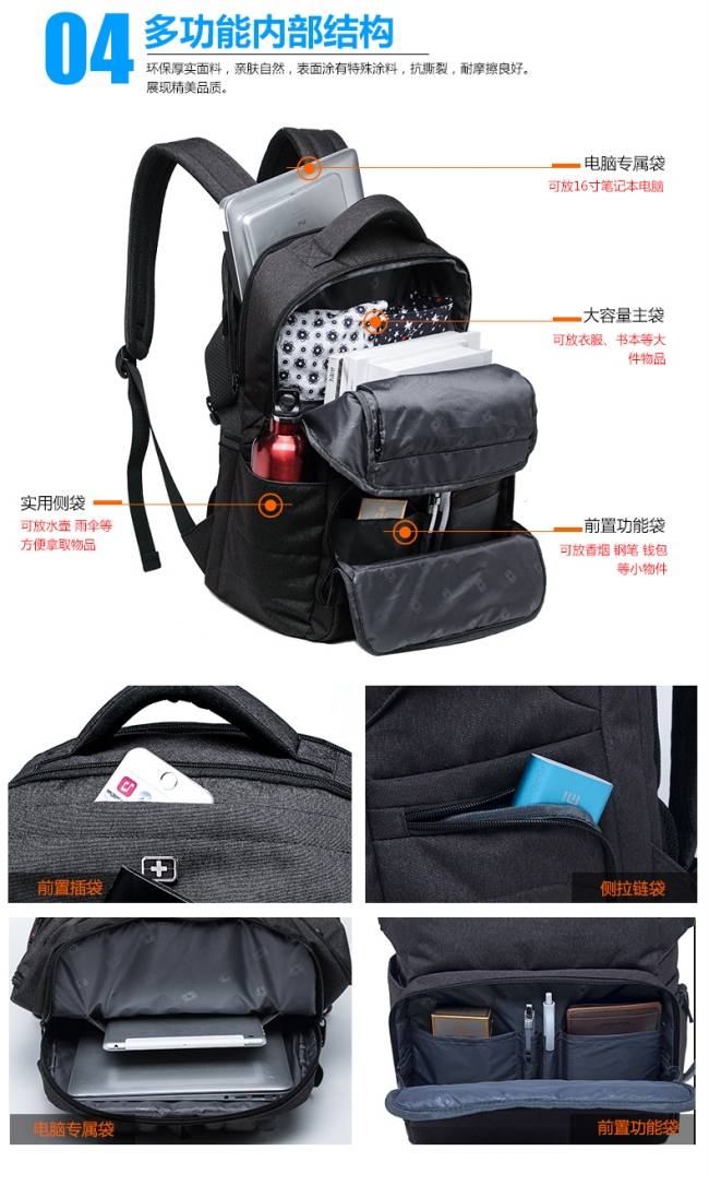 内部结构: 网袋 拉链暗袋 手机袋 证件袋 夹层拉链袋 电脑插袋 相机插袋