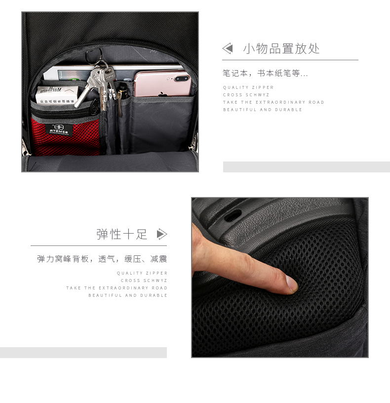内部结构: 网袋 拉链暗袋 手机袋 证件袋 夹层拉链袋 电脑插袋