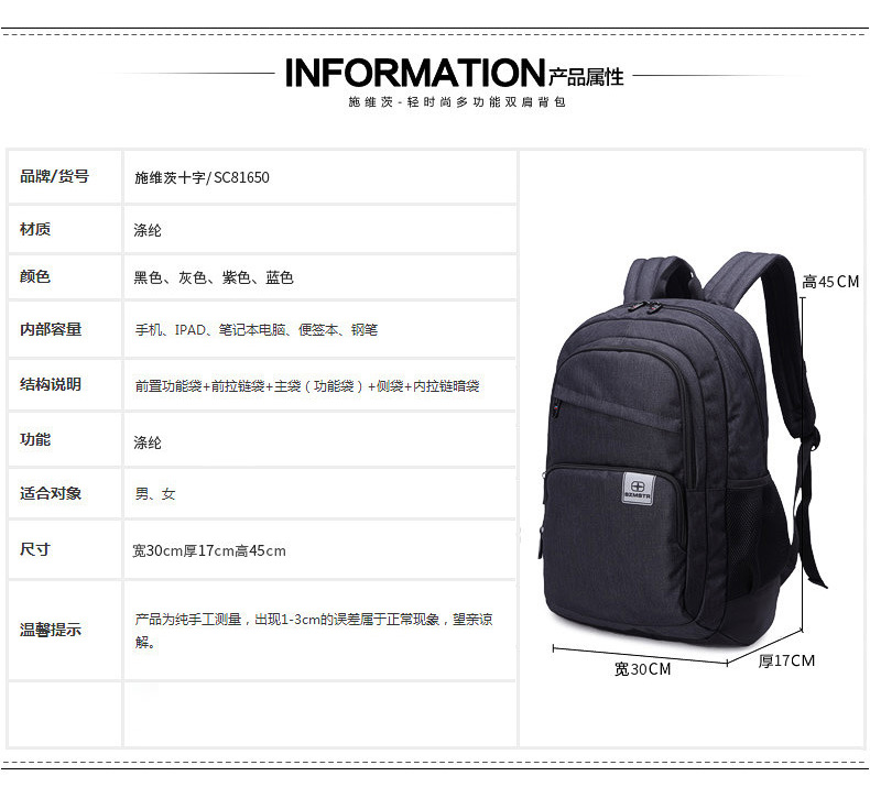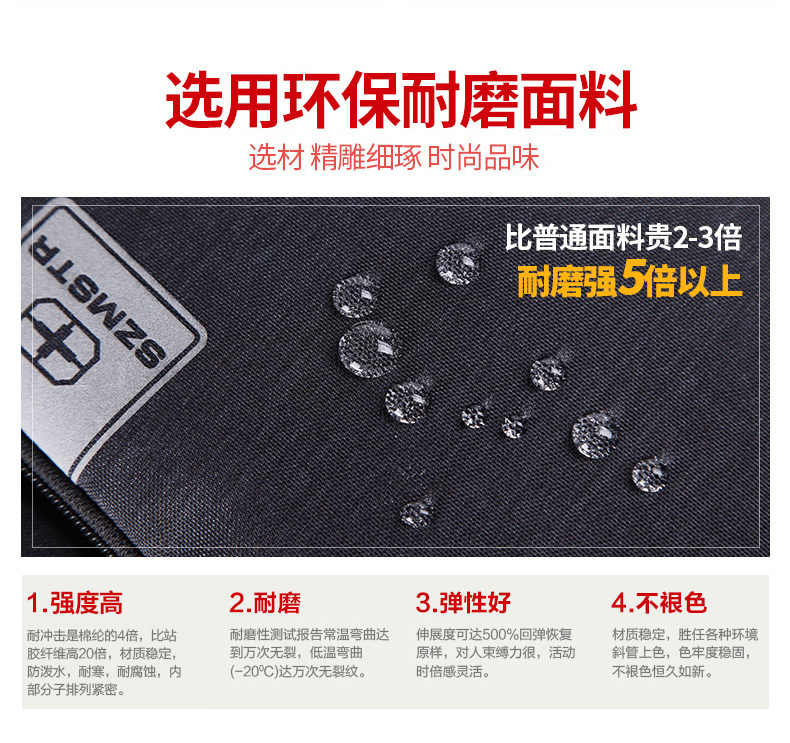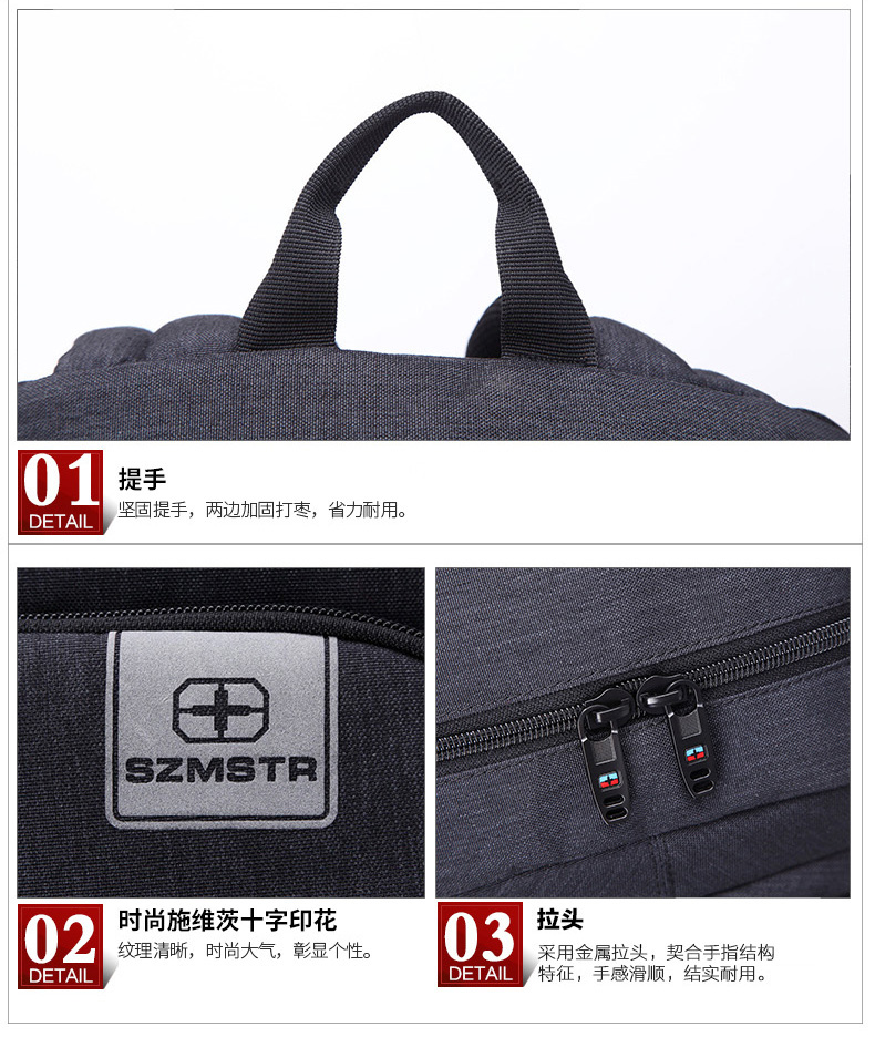 内部结构: 网袋 拉链暗袋 手机袋 证件袋 夹层拉链袋 电脑插袋 相机插袋