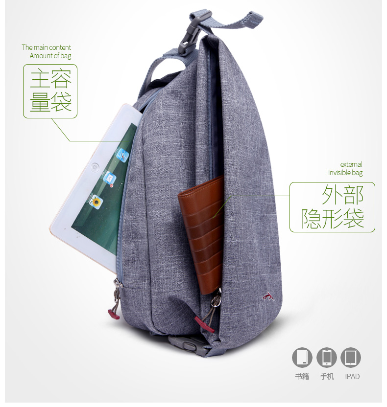 内部结构: 拉链暗袋 手机袋 证件袋 夹层拉链袋 电脑插袋 相机插袋