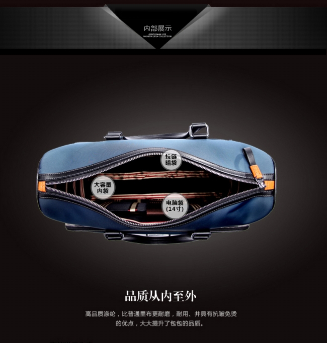 内部结构: 拉链暗袋 手机袋 证件袋 夹层拉链袋 电脑插袋