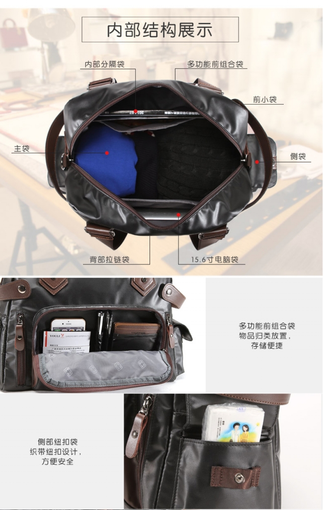 内部结构: 拉链暗袋 手机袋 证件袋 夹层拉链袋 电脑插袋 相机插袋